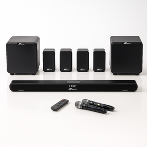 The AuroraSound StageBar X7 5.2 Wireless Karaoke Cinema is designed for those who demand the best. This premium home entertainment system pairs a sleek, high-output soundbar with four compact wireless satellites, dual powered subwoofers, and two studio-grade wireless microphones. With HDMI eARC, advanced DSP, and a front display for quick control, StageBar X7 delivers room-filling cinematic sound and instant party-ready karaoke in a modern, minimalist setup.